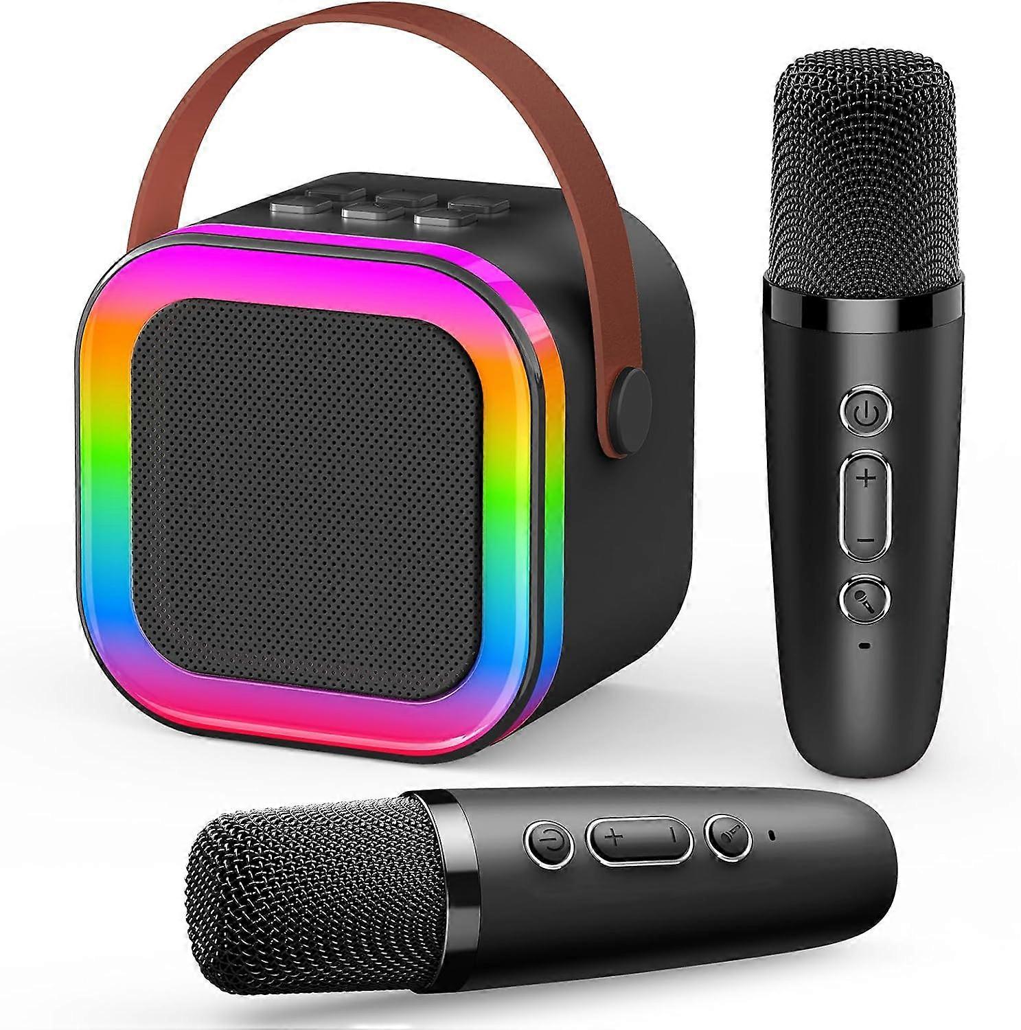 Karaoke Machine with 2 Microphones Kids Microphone Toys for Girls Birthday Presents Teenage Girls Gifts 【Hi-Fi Sound Quality】The portable Bluetooth speaker and 2 wireless microphones are equipped with high-performance audio drivers and advanced digital signal processor to make the sound clearer and bring you a perfect singing experience. 【Lighting & Bluetooth 5.0】After successfully connecting via Bluetooth "K12", the sound of playing music may be too loud, you can adjust the volume through the "+" "-" of the stereo and microphone. "PS: If you still feel the volume is too loud, you can also adjust the volume of your mobile phone. Please do not put the microphone close to the speaker!Dazzling light effects along with the music, dance it up~! 【Multifunctional Karaoke】With 4 magical sound effects, it's fun for kids, and the LED lights dance to the rhythm of the music to create a fun atmosphere. With a headphone output on the back, it's perfect for singing practice and family karaoke, and its compact size makes it easy to take with you when you're travelling. 【Long Battery Life】It has a built-in rechargeable battery that ensures 5-10 hours of playback time. Charge faster and last longer. Birthday parties, meetings, classes, outdoor activities and more. This portable Bluetooth speaker and wireless microphone will meet all your "Sing for Joy" needs. 【Ideal Gift for Music Lovers】If you are looking for a unique gift for someone who loves music, this vintage bluetooth speaker is the perfect choice! Exquisite gift packaging can be used as Christmas, birthday, Halloween gifts!