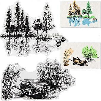 Tree Lake Scenery Background Clear Rubber Stamp Boat River Vintage Transparent Silicone Seals Stamp Retro for Journaling Card Making DIY Scrapbooking