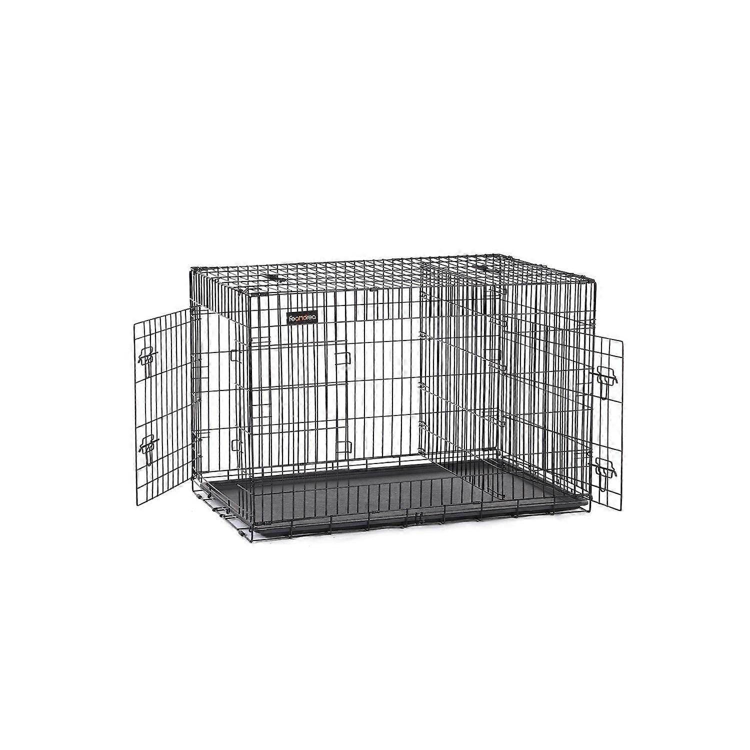 Homestorecity hondenkooi met 2 deuren, hondenbox, draadkooi, transportbox, opvouwbare draadkooi voor katten, konijnen, knaagdieren, konijnen, pluimvee, kooi, zwart, XXXL, 122 x 81 x 76 cm PPD48H - Productomschrijving: Honden zouden normaal gesproken vrij rond moeten kunnen rennen in uw huis. In sommige situaties is het echter raadzaam om deze dierenkooi van 122 x 74,5 x 80,5 cm te gebruiken. Dierenliefhebbers kunnen ook de volgende voordelen verwachten: - Eenvoudig te monteren zonder gereedschap - Opvouwbaar; gemakkelijk te vervoeren; kan worden opgeborgen om ruimte te besparen - 2 afsluitbare deuren - Gemaakt van gepoedercoat ijzerdraad zonder scherpe randen; stabiel, roestbestendig, veilig - Kunststof omhulsel ter bescherming van uw vloer - Uittrekbare kunststof lade; Maakt het schoonmaken van de bench gemakkelijker - Verwijderbare verdeler Productdetails: - Kleur: Zwart - Materiaal: IJzerdraad - Afmetingen: 122 x 74,5 x 80,5 cm (L x B x H) - Gewicht: 17,3 kg Omvang van de levering: - 1 x hondenkooi - 1 x gebruiksaanwijzing (DE, EN, FR, IT, ES) Homestorecity Opmerkingen: - Bij gebruik buitenshuis, beschermen tegen regen. - Niet op de bench staan of zitten. Ook geen voorwerpen op de bench plaatsen. - De bench is geen speelgoed. Kinderen mogen niet in de bench klimmen of erin spelen. - Zorg ervoor dat de halsband van uw huisdier tijdens het transport niet blijft haken aan de tralies van de bench. - Bij het meten kunnen er afwijkingen van 1-2 cm van de opgegeven afmetingen optreden. - Meet voor aankoop de lengte, maat en breedte van uw hond en vergelijk het resultaat met de afmetingen van onze bench. - Hoewel de Homestorecity hondentransportbox is gemaakt van zeer robuust metaaldraad, kan deze door herhaald gebruik vervormen.