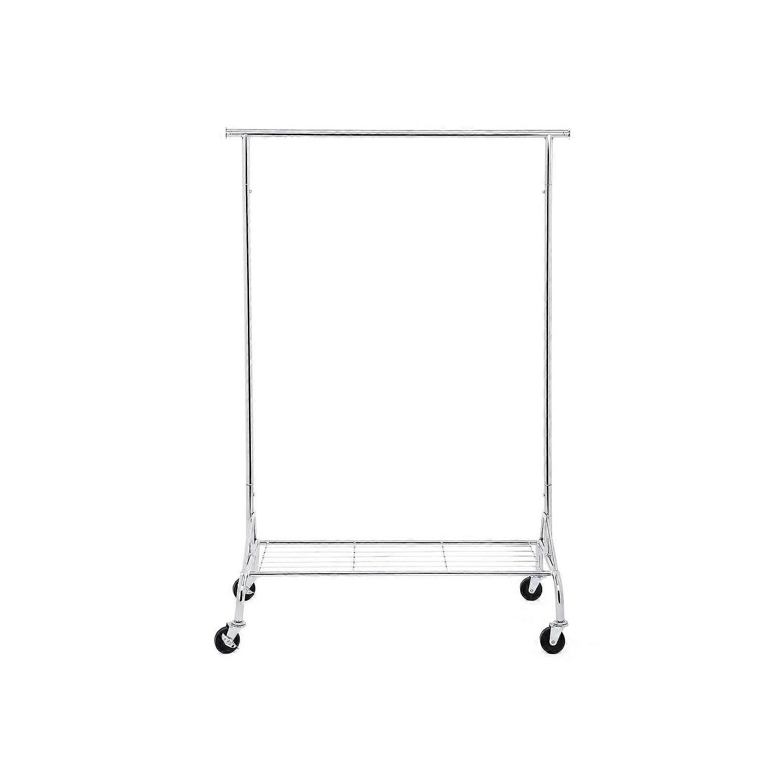 Homestorecity Metalen Kledingrek, Heavy-Duty, met Schoenenrek, op Wielen, Draagvermogen tot 50 kg, Lengte 110,5-150,5 cm, Verchroomd - De bovenste stangen zijn flexibel uitschuifbaar (0-20 cm aan elke kant) en het gladde metalen oppervlak maakt het gemakkelijk om ze uit te trekken. De onderste plank van metaaldraad is perfect voor het opbergen van schoenen, koffers of opbergmanden, enz. Het zorgvuldig dichtgeweven metaaldraad zorgt voor het netjes opbergen van niet alleen grote items, maar ook kleinere items zoals kinderschoenen. Met vier industriële heavy-duty wielen kunt u het kledingrek gemakkelijk in elke richting manoeuvreren; twee wielen hebben remmen, waardoor het kledingrek indien nodig kan worden vergrendeld, waardoor ongewenst wegglijden wordt voorkomen. De wielen zijn gemaakt van hoogwaardig materiaal en zijn allemaal geurloos. Opmerkingen: Er zijn lichte krasjes op het gelaste gebied veroorzaakt door het slijpen van de lasnaden. Dit zijn geen defecten, dus maak u geen zorgen. Als de industriële wielen bij het uitpakken "nieuw" ruiken, verdwijnt deze geur na korte tijd in een geventileerde ruimte. De ideale uittrekafstand van de bovenste dwarsbalk is 0-20 cm. Productdetails: Afmetingen: (110,5-150,5) x 160 x 48,5 cm (B x H x D) Wielhoogte: 9,5 cm Materiaal: verchroomde ijzeren buizen Verpakkingsafmetingen: 111 x 41 x 6,3 cm (B x H x D) Nettogewicht: 4,7 kg Brutogewicht: 5,7 kg Leveringsomvang: 1 x kledingrek 1 x handleiding
