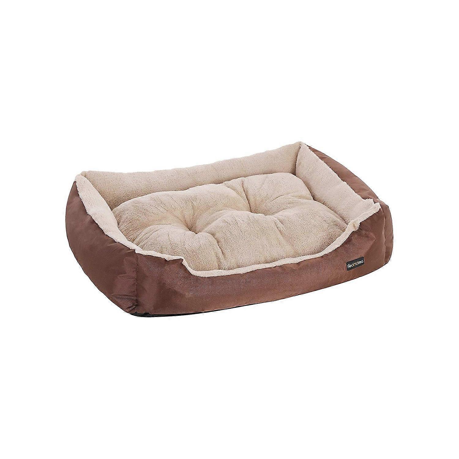 Homestorecity Hondenbed, Hondenmand met Omkeerbaar Kussen, 85 x 65 x 21 cm, Bruin - De makers van ons nieuwe merk Homestorecity weten dat uw huisdier een bijzondere rol in uw leven speelt en dat u hem of haar een zo comfortabel en plezierig mogelijk leven wilt bieden. Met dit in gedachten hebben ze gezellige, functionele, stijlvolle en bovenal huisdiervriendelijke meubels voor huisdieren ontworpen, zoals de hondenmand hierboven afgebeeld. Kwaliteit of stijl? Deze hondenmand hoeft geen twijfel te zijn, want hij combineert beide componenten. De robuuste Oxford-stof aan de buitenkant is bestand tegen zelfs de hardste pootstoten; de elegante bruine stof maakt de hondensofa echter tot een stijlvol meubelstuk. Ook het lichtgekleurde, omkeerbare fleecekussen draagt hieraan bij en vormt een effectief contrast met het donkerbruine van de buitenstof. Een plek van veiligheid: de opstaande randen van deze hondenmand zorgen ervoor dat uw viervoeter zich goed beschut voelt. Tocht en koude vloertemperaturen zijn bijzonder goed beschermd dankzij de hoge wanden en uitstekende vulling. Mist uw hond nog steeds een gezellig bed? Bestel dan dit hondenbed voor dieren tot 30 kg. Productdetails: - Kleur: Bruin-Beige - Materiaal: 150D Oxford-stof, fleece, polypropyleenvulling - Afmetingen: 85 x 65 x 21 cm (L x B x H) - Gewicht: 1,7 kg. Leveringsomvang: - 1 x Homestorecity hondenbed. Opmerkingen: - Stel het product niet bloot aan direct zonlicht en plaats het niet in een vochtige omgeving. - Dit hondenbed is geen kauwspeeltje voor uw viervoeters; voorkom dat uw hond op het bed bijt. - Ons hondenbed is opgevouwen voor verpakkingsdoeleinden. Het kan daarom 2-3 dagen duren voordat het weer in de normale vorm is. Vanwege naadtoeslagen kunnen producten van dit type maximaal 3 cm afwijken van de vermelde afmetingen.