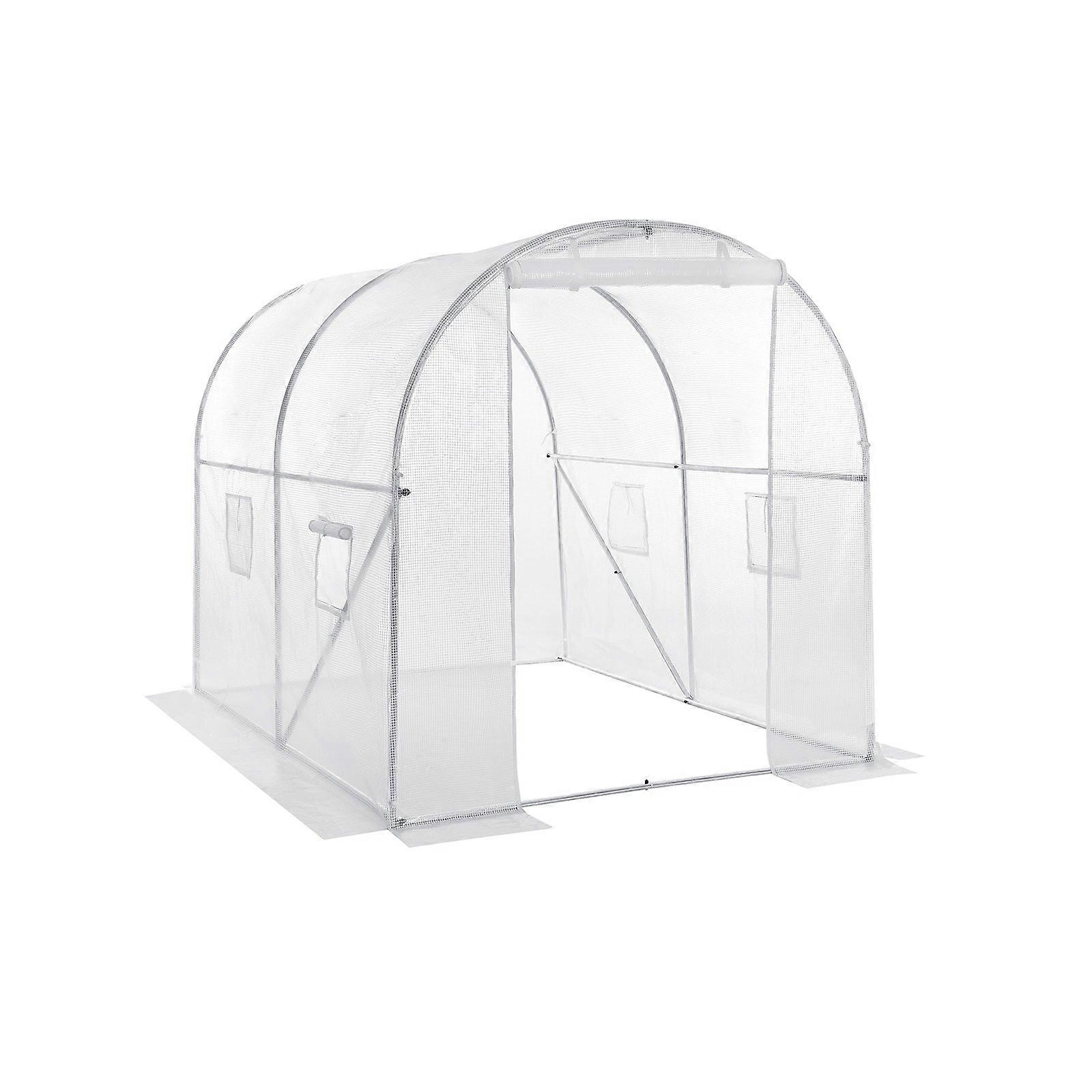 Homestorecity Kunststof Kas, Inloop Tuinhuis, 250 x 200 x 200 cm, met Deur, 4 Ramen, Tomatenhok, Grondpennen, Buiten, Tuin, Groen - Waarom zou u een kas moeten hebben? Wilt u in de winter zaaien of uw favoriete bloemen kweken? Met deze kas creëert u een warme en veilige haven voor uw planten - een must-have voor alle tuinliefhebbers. Fruit, groenten, bloemen, planten. Met een afmeting van 250 x 200 x 200 cm creëert deze kas een toevluchtsoord voor alle planten. U kunt hem in verschillende secties verdelen: één voor uw favoriete groenten zoals tomaten en sla, één voor heerlijk fruit zoals druiven en aardbeien, en één voor andere planten en bloemen. Met deze kas blijft uw tuin zelfs in de winter mooi Productdetails: - Kleur: Wit - Materiaal: Staal, PE - Afmetingen: 250 x 200 x 200 cm (L x B x H) - Gewicht: 19 kg Leveringsomvang: - 1 x Kas - 4 x Grondpennen - 1 x Accessoirepakket - 1 x Handleiding (DE, EN, FR, ES, IT)