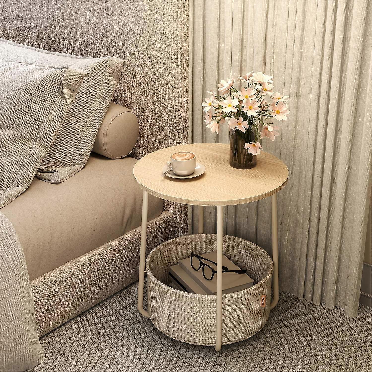 Ronde bijzettafel, kleine tafel, kleine salontafel, woonkamertafel met stoffen mand, opbergruimte voor de woonkamer of slaapkamer, ebbenhoutzwart en leigrijs. Productdetails: Kleur: natuurlijk beige en crèmewit Materiaal: spaanplaat, staal, polyesterweefsel Afmetingen bijzettafel: 45 cm diameter, 50 cm hoogte Afmetingen stoffen mand: 39,6 cm diameter, 18,2 cm hoogte Totaalgewicht: 4,1 kg Maximale statische belastbaarheid van het tafelblad: 35 kg Leveringsomvang: 1 x bijzettafel, 1 x stoffen mand, 1 x accessoirepakket, 1 x handleiding