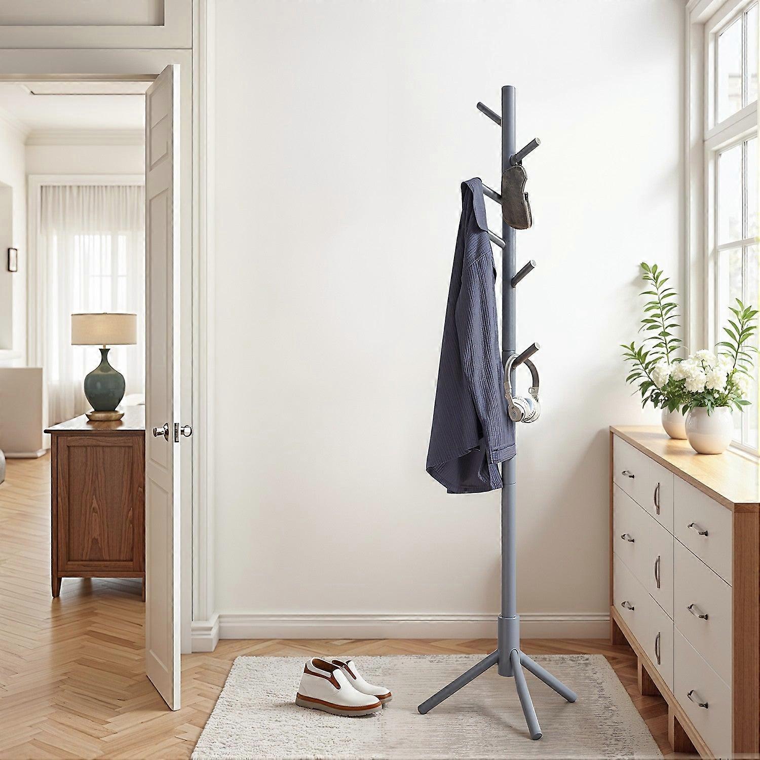 Kapstok, kapstok van massief hout, kapstok in de vorm van een boom, 8 haken, 3 verstelbare hoogtes, voor kleding, hoeden en tassen, wit - Specificaties: - Afmetingen: 47 x 47 x 175 cm (D x B x H) - Lengte per haak: 12,3 cm - Gewicht: 2,2 kg - Maximale totale statische belasting: 24 kg - Materiaal: Massief hout - Kleur: Grijs
