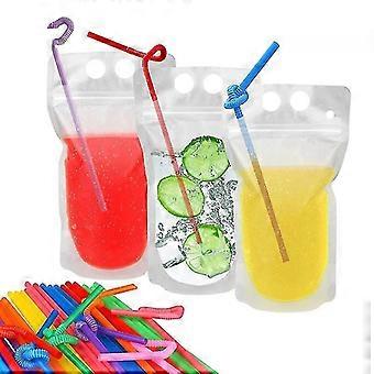 100pcs Clear Drink Pouches Reusable Drinks Bags Portable Stand-up With Straw
