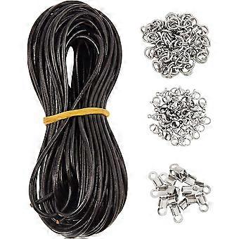 10m Cowhide Leather Cord with 2 Sizes 40pcs Stainless Steel Fold Over Crimp Cord Ends & 100pcs Jump Rings & 40pcsLobster Claw Clasps for DIY Necklace