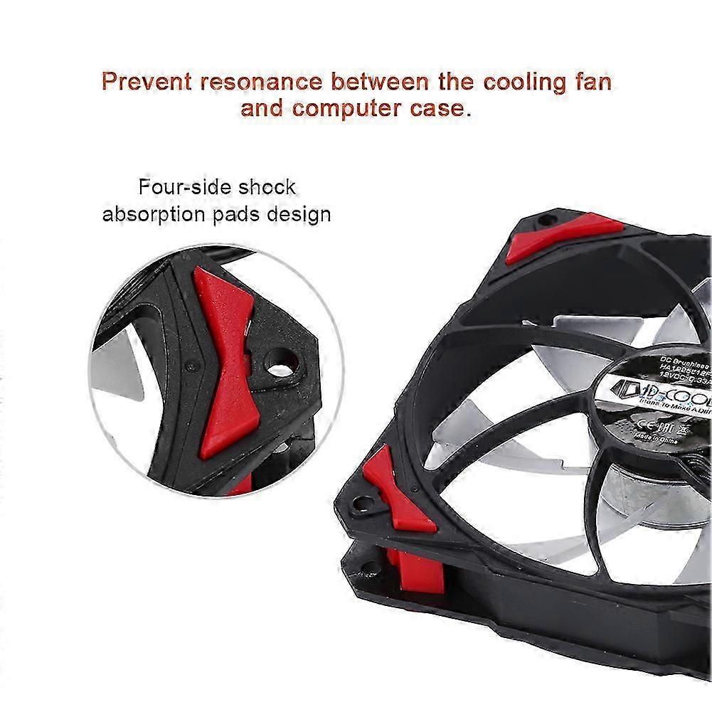 Description:It is high time to replace your old cooling fan with this super cool cooling fan on your favorite computer. This CPU cooler is compatible for all computers with 4pin. It dissipates the heat effectively with high rotation speed and bionic blade design. With four-side shock absorption pads design, it prevents resonance between the cooling fan and computer case. Ultra low noise makes you more focused on your work, study or games. With high-tech feeling and LED lights glowing when it is working, your computer will like a high-tech device in a sci-fi films. It is perfect for you to build a 'optical pollution' computer. Isn't that cool, is it? What are you waiting for? Just have one!Features:1.4 LED Lights, glowing gentle light while it's working; a perfect fit for "optical pollution" computer.2. Standard 12cmm size, widely used in air-cooling, water-cooling or other CPU radiators.3. 4Pin temperature control design to achieve a dynamic equilibrium between mute and performance.4. With four-side shock absorption pads design, it prevents resonance between the cooling fan and computer.5. Bionic blade design offers greater blast capacity and wind pressure, which dissipate the heat effectively.Specifications:Type: Cooling FanMaterial: ABSLight Color: Red, Blue, White and Green(Optional)Fan Connector: 4Pin(2510)Rated Voltage: DC 12VCurrent: 0.33ARated Power: 3.96WRated speed: 800-2200RPMMax. Air Flow: 71.2CFMMax. Static Pressure: 2.57mmH2ONoise: 14.0-35dB(A)Size: 120 * 120 * 25mm / 4.7 * 4.7 * 1inchWeight: Approx. 150gPackage Include:1 x LED Cooling Fan4 x Screws1 x 4Pin Cable1 x Mainboard Connection CableNote:Monitors are not calibrated same, item color displayed in photos may be showing slightly different from the real object. Please take the real one as standard.