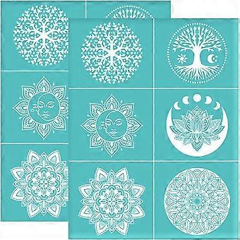 2pcs 8.6x11 Inch Self-Adhesive Mandala Stencil Lotus Tree Silk Screen Stencils Reusable Silkscreen Printing Stencils Moon Sun Mesh Transfer for Painti