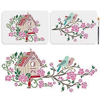 2pcs Birds Nest Stencil 11.78.3inch Flower Leaves Tree Branch Stencils for Painting with Paint Brush Spring Bird House Template for Crafts Wood Wall F