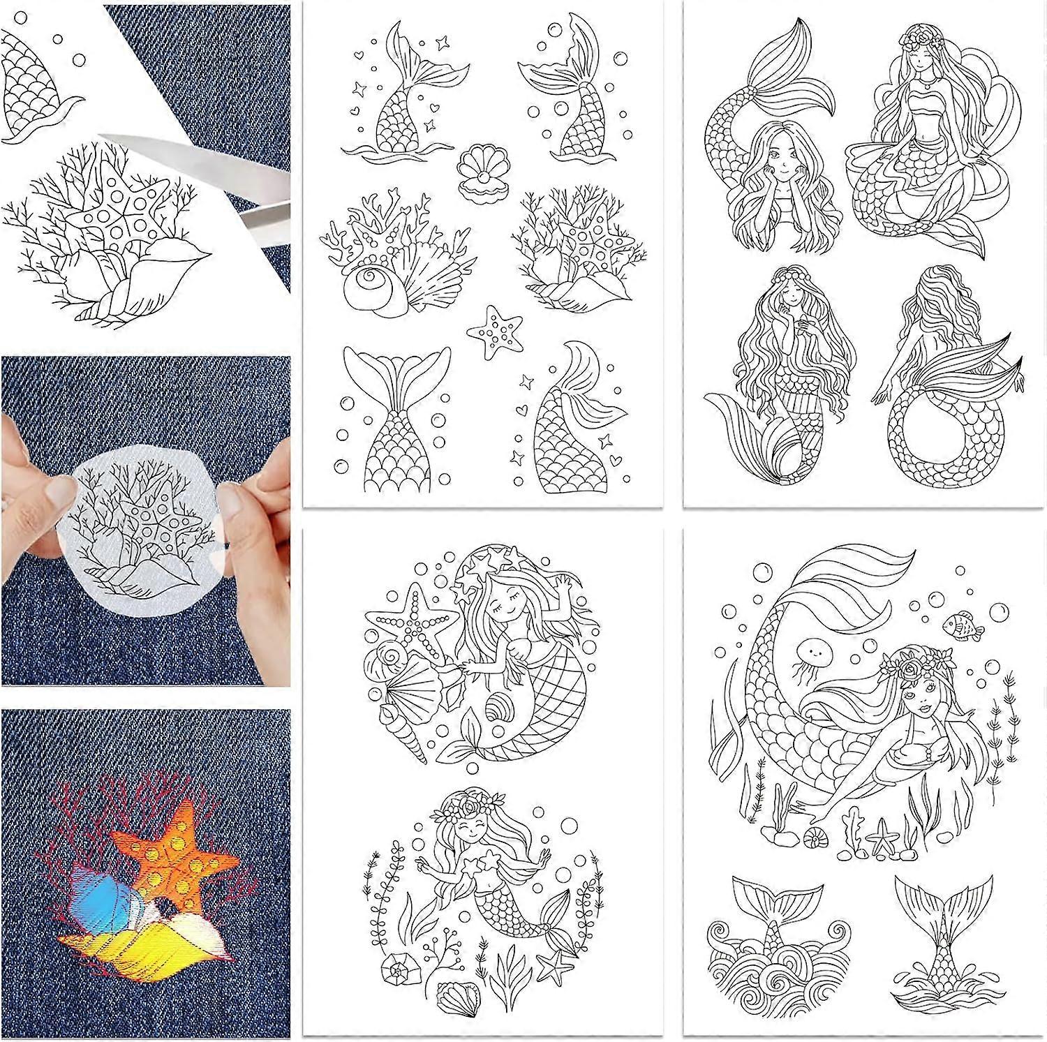 4 Sheets Mermaid and Shells Skeleton Water Soluble Stabilizer Hand Sewing Stabilizers with Pre Printed Stick and Stitch Self Adhesive Wash Away Stabil