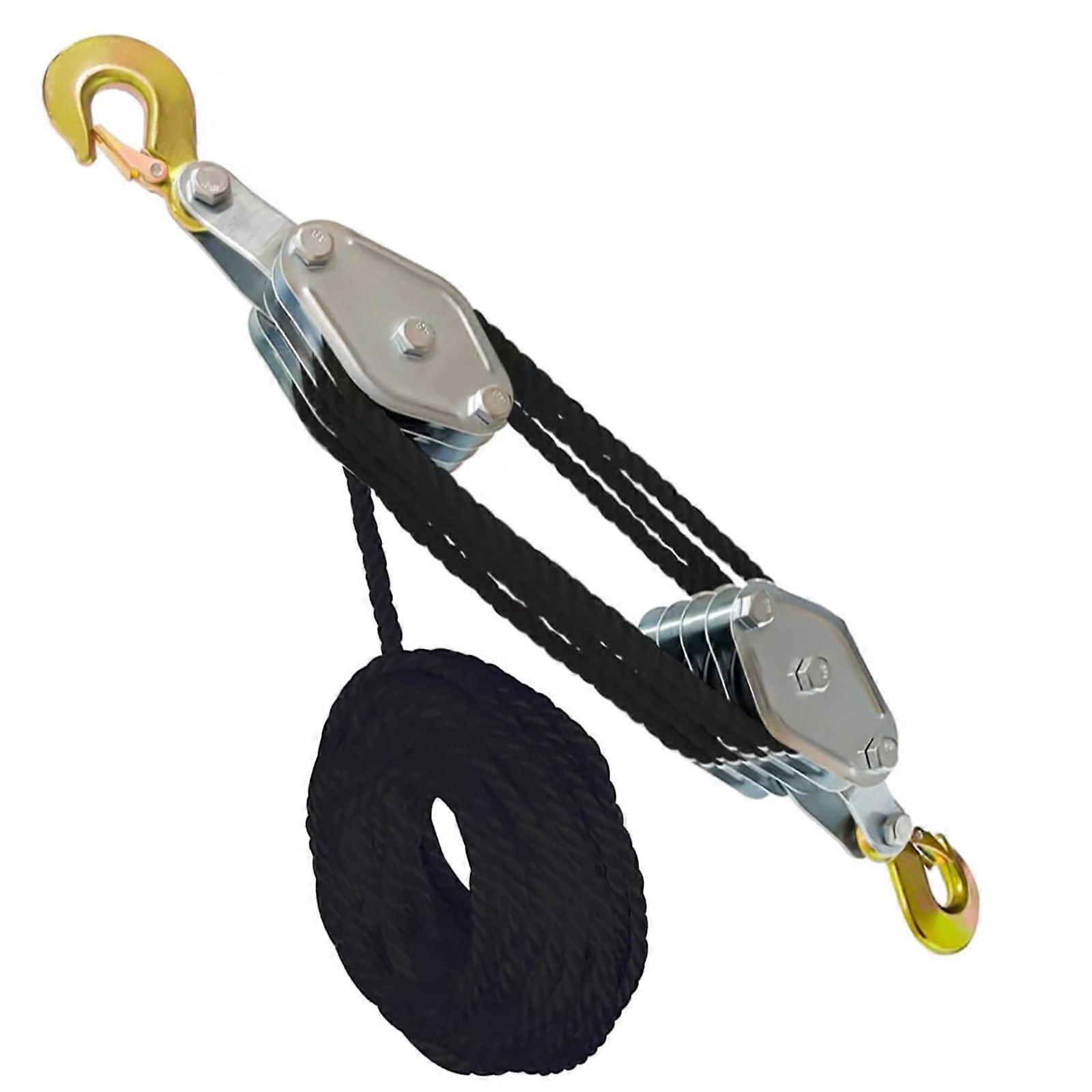 - 1.65 feet of 0.3-inch poly rope with a robust 4000 lb breaking strength and a 2000 lb load capacity ensures reliable performance for heavy lifting tasks. - Constructed from high-strength tensile polypropylene, the rope is designed to resist fraying, providing durability for repeated use. - The wheel block and tackle system features a zinc-plated steel housing, enhancing resistance to wear and tear, while safety hooks keep the hoist securely in place during operation. - This manual hand rope hoist requires no electricity or external assistance, making it ideal for remote locations or emergency situations. With a 7:1 lifting ratio, just one pound of effort can lift up to seven pounds, allowing for easy one-handed operation of heavy objects. Use Scenarios: 1. Perfect for lifting heavy equipment in workshops or garages without the need for electrical power. 2. Ideal for construction sites when you need to hoist materials vertically without complex machinery. 3. Useful for outdoor activities like pulling tree branches or securing large items during transport. This product combines strength, convenience, and efficiency, making it an essential tool for any lifting task.