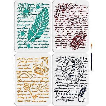 4pcs Retro French Writing Stencils 11.78.3inch Large French Script Stencil with Paint Brush Vintage Text Feather Rose Pattern Drawing Templates for Cr