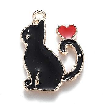 5pc Alloy Enamel Pendants Kitten with Heart Black 25x20x1.5mm Hole: 2mm