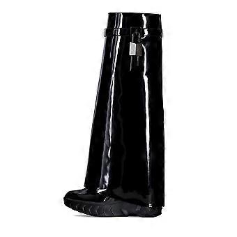 8 cm Women's Black Cigarette Boots Wedge Heel Round Toe Long Trousers Boots with Belt Buckle Size 42 EU