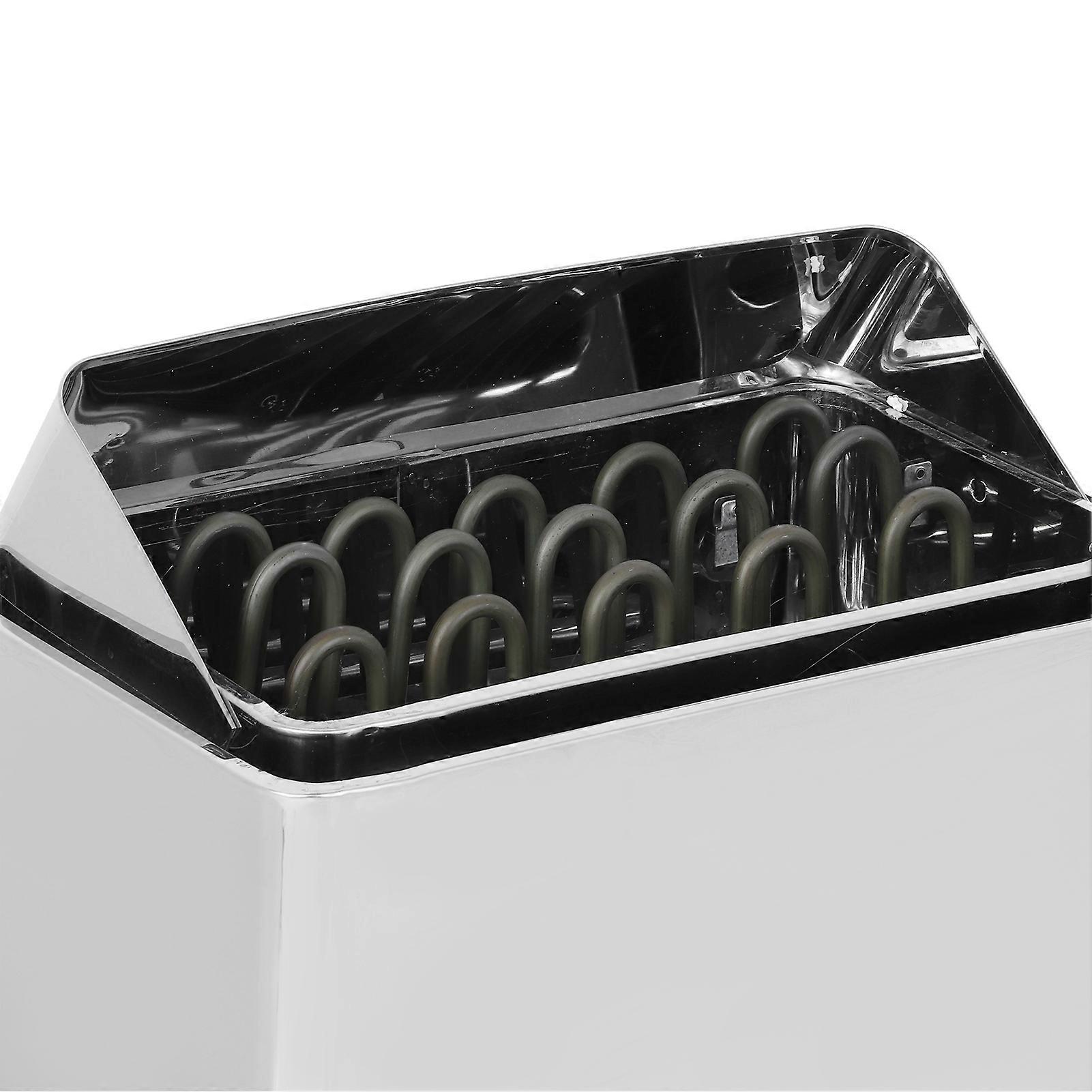 9KW Stainless Steel Sauna Stove Heater Steaming Room Bathroom SPA Equipment 220‑380V Condition: Item Type: Sauna Heater Stove Material: Stainless Steel Model: SCA-90BS Power: 9KW Use Space: 9-13㎡ Furnace Tube Voltage: 220-380v Sauna Room Volume: Maximum: 9m³, Minimum: 13m³ Application: Apartments, Hotels, Indoor Swimming Pools, Sauna Rooms, Steam Rooms, Fitness Centers and Other Commercial Facilities. Minimum Distance: Side: 13cm / 5.1in, Ground: 500mm / 19.7in o More; Distance of Shelf: 20cm / 7.9in, Ceiling: 110cm / 43.3in, Ground: 18cm / 7.1in Weight: Approx. 10900g / 384.5oz Product Size: Approx. 56.5x40.5x28.5cm / 22.2x15.9x11.2in Installation Method: 1. Install the sauna stove on the wall with the provided screws. The stove can also be installed in the tabernacle with a minimum height of 1900 mm;2. The wall behind the stove cannot be covered with cement, board or similar materials. Because the covering layer will cause the wall material to exceed the allowable temperature limit; 3. Use qualified materials for wall and ceilings; Power Cord Connection: 1. The connection of the power cord must be completed by a professional electrician and in line with current regulations. Use REVE rubber insulated cable (or similar) to connect to the main power supply of the furnace; 2. The connection box of the stove is equipped with wiring terminals, and the crossed section of the connection wire is the same as that of the sauna heater. The junction box in the sauna room must be sealed, splatter-proof, and have a moisture condensation hole with a diameter of 7 mm. The center of the box must not be 500 mm above the ground. Sauna Stone: The sauna stone may be dusty, so we recommend to rinse it before putting it in the stone warehouse. The largest stone is placed at the bottom, and it should not be too tight when placed, and pay attention to leaving a ventilation space. The stone must be replaced when it starts to peel to avoid damage to the sauna heater. The diameter of the stone is generally 3-8 cm Temperature Control: According to the size of the sauna room, the sauna heater reaches the set temperature after 30-60 minutes. The sauna room maintains a uniform and comfortable temperature and adjusts itself as needed. Ventilation: In order to make the sauna as comfortable as possible, the sauna room must have good ventilation. It is best to drill an air hole in the wall panel near the bottom of the sauna heater to let air in from there. The diameter of the air inlet should be at least 6 cm. The air outlet is best on the wall opposite to the air inlet, and the farther away from the air inlet, the better. The diameter of the air outlet should be twice the diameter of the air inlet, and it should be as far away from the ground as possible, below the upper seats