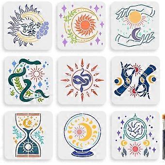 9pcs Sun and Moon Divination Stencil 7.87.8inch Divination Magic Stencils Moon Star Hands Crystal Ball Hourglass Drawing Template with Paint Brush for