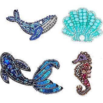 4pcs 4 Styles Ocean Animals Embroidered Rhinestone Applique Ocean Life Shell Starfish Sew On Embroidery Patches for DIY Craft Party Dress Costume Jean