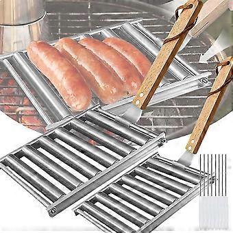 Stainless Steel Sausage Roller Grill with Wood Handle for Outdoor Camping BBQ and Picnic