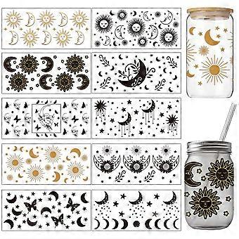 10 Sheets UV DTF Cup Wraps for 16 OZ Glass Cups, 10 Styles Sun Moon Plants Butterflies Stars Rub on Transfers PVC Transfer Stickers Waterproof Rub Dec