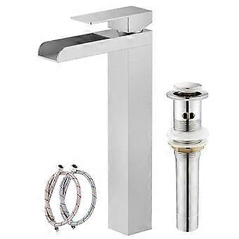 Brushed Nickel Tall Waterfall Vessel Sink Faucet, Single Handle Bathroom Mixer for 1 Hole Vanity, Modern Design