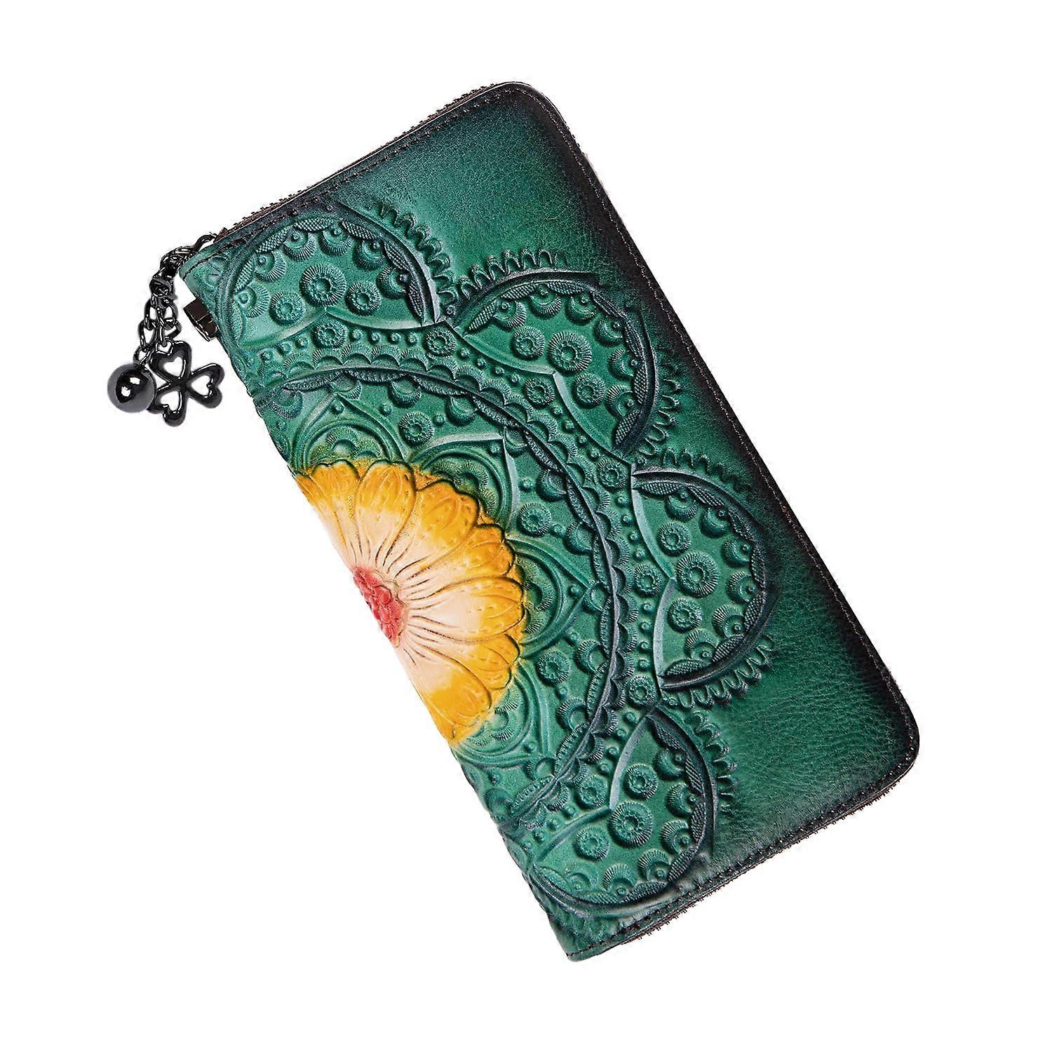 Wallet Genuine Leather for Women with RFID Blocking, Large Capacity Checkbook and ID Slot, Vintage Sunflower Blue Style