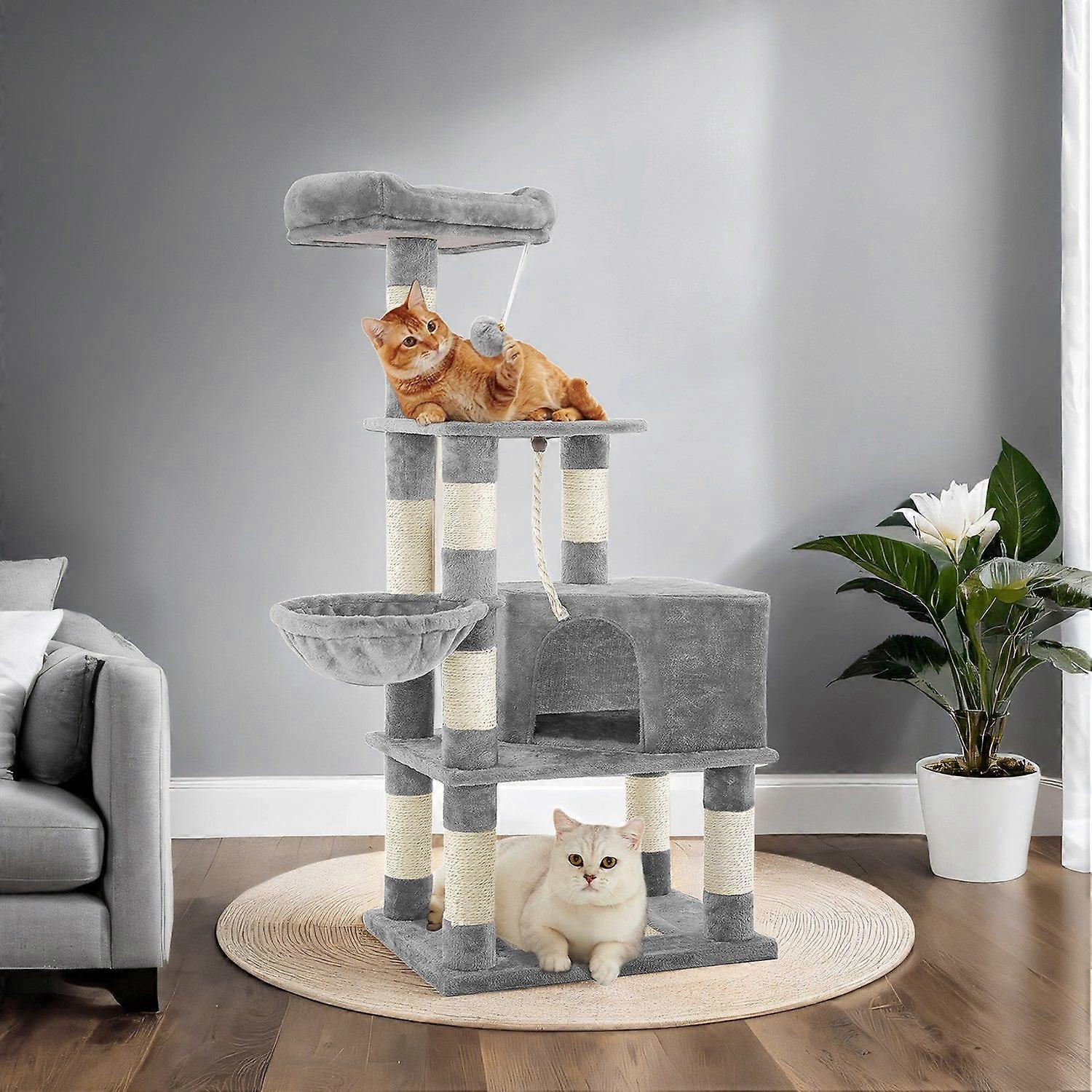 Krabpaal, meerlaagse krabpaal met hol, hangmat en 4 krabpalen, beige - Middelgrote krabpaal om in te spelen en te loungen. De ideale krabpaal voor katten die graag ravotten en in een knus bedje liggen. De met pluche beklede rustplekken bieden een comfortabele plek om te liggen en zijn ook ontworpen om in te ravotten. Multifunctionele krabpaal. Met talloze krabmogelijkheden op elke paal en bodemplaat, een hol, een hangbak en rustplekken, zijn er talloze manieren waarop uw kat optimaal van de krabpaal kan genieten. Er is ook een klassiek visspel bevestigd, zodat uw kat zijn speelse instincten kan uitleven. Met de meegeleverde montage-instructies zet u de krabpaal snel en veilig in elkaar. Productdetails: Kleur: Lichtgrijs Materiaal: Spaanplaat, pluche, sisal, versterkte kartonnen palen Afmetingen: 55 x 40 x 138 cm (L x B x H) Gewicht: 13,5 kg Pakketinhoud: 1 x krabpaal 1 x gebruiksaanwijzing (DE, EN, FR, IT, ES) Homestorecity-opmerkingen: Plaats de krabpaal op een vlakke vloer tegen de muur. Vermijd vocht in de buurt van de krabpaal. Houd kinderen uit de buurt van de krabpaal. Als onderdeel van onze merkoptimalisatie hebben we oude verpakkingen vervangen door nieuwe. Deze worden willekeurig geselecteerd voor verzending van elk product, dus het is mogelijk dat u een verouderde versie van de verpakking ontvangt. Het product zelf is echter natuurlijk up-to-date. Door ons merk voortdurend te ontwikkelen, willen we uw winkelervaring continu verbeteren.