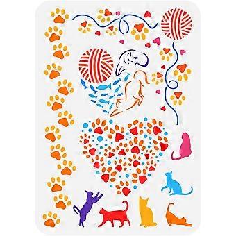 Cats Stencil for Painting 8.3x11.7inch Large Cat Paw Print Painting Stencil Reusable Cat Fish Wool Ball Drawing Template Hollowed Heart Pattern Frame