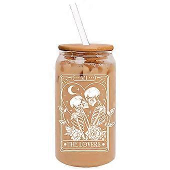 16oz Glass Iced Coffee Cup Can Shaped with Bamboo Lid and Straw Unique Skeleton Tarot Design