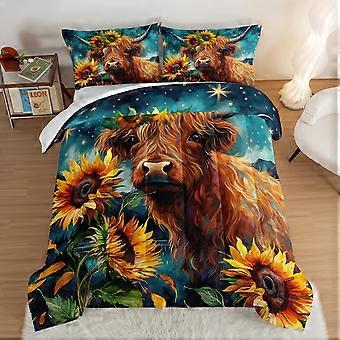 Highland Cow Comforter Set Queen with Sunflower and Starry Sky Design, Soft Microfiber Bedding 3Pcs