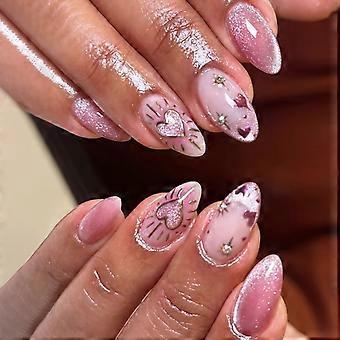 Pink Almond Press on Nails with Rhinestones Glitter French Tip Fake Nails Reusable 24Pcs