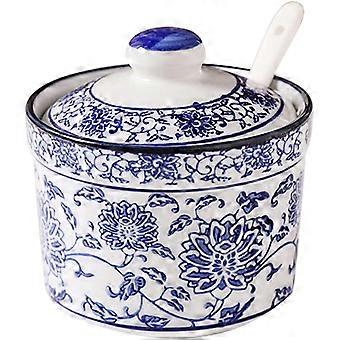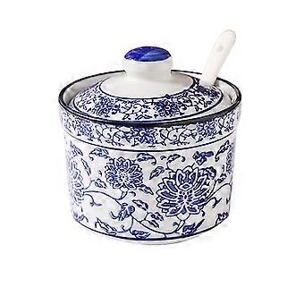 Blue and White Porcelain Sugar Bowl with Lid and Spoon, Small Ceramic Pot for Coffee Bar