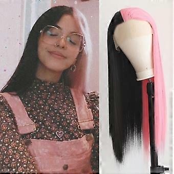 Long Straight Black and Pink Lace Front Synthetic Wig, Heat Resistant, with 2 Wig Caps