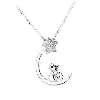 Moon and Star Silver Necklace with Cat Pendant, Delicate Clavicle Design, Elegant Jewelry for Women with Rhinestones and Meaningful Message