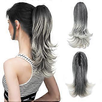 Ponytail Hair Extension 14 Inch Curly Claw Clip Synthetic Black with Gray and White Tips for Women