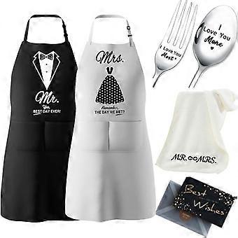 Mr and Mrs Apron Set with Pockets, Wedding Gift for Couples, 6pc Kitchen and Ring Dish Bundle