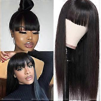 Short Black Straight Human Hair Wig with Bangs, Medium Length 15' Natural Texture Adjustable Cap