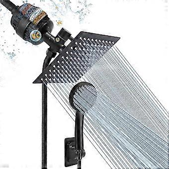 Filtered Rain Shower Head, High Pressure 8 ″ Square and 5 Settings Self Adhesive Holder/1.5m Hose -1 Changeable Filter Cartridge (matte black)