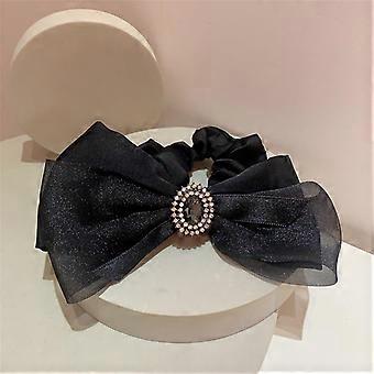 Gray Black Satin Hair Scrunchie with Diamond Buckle, Handmade No Crease Hair Tie for Women