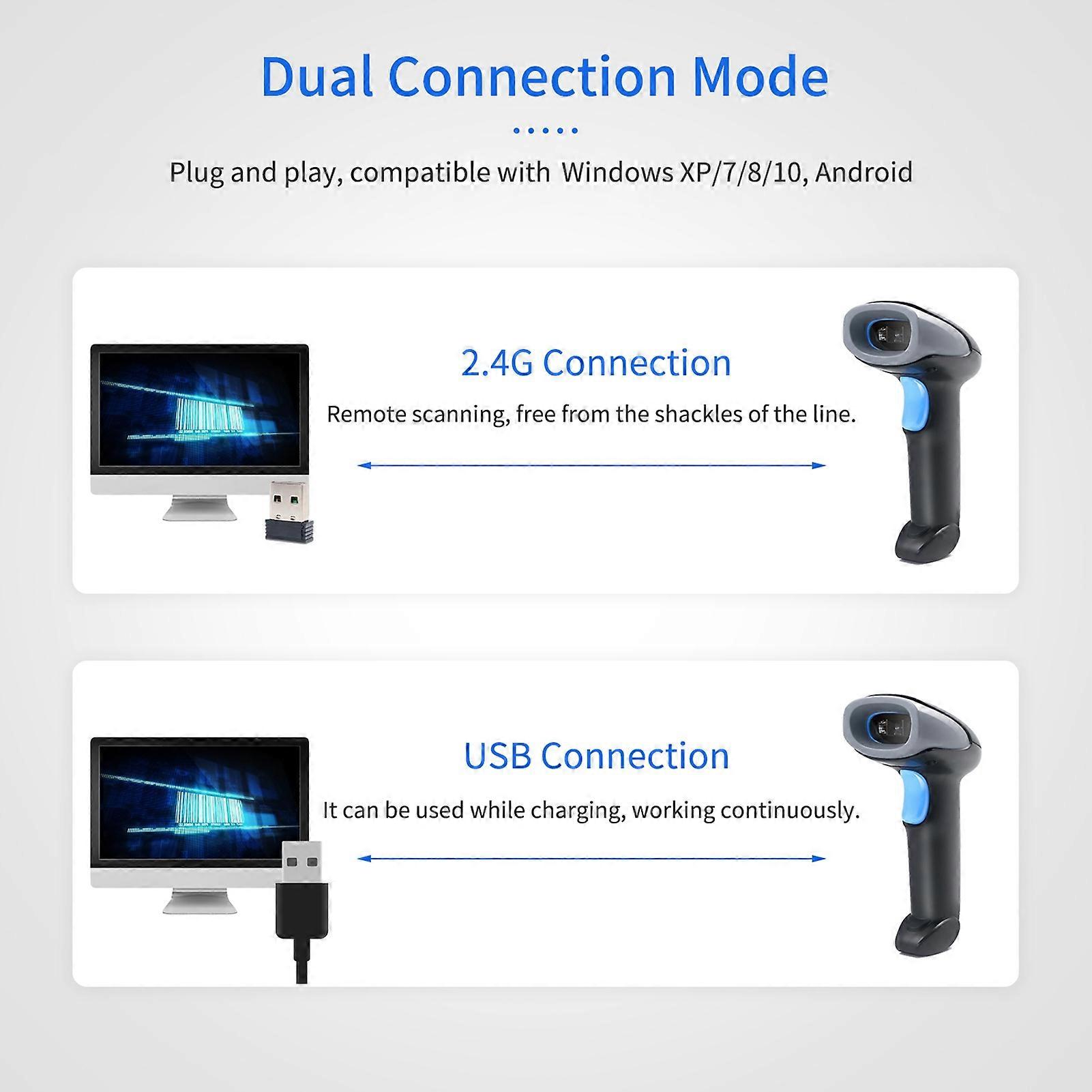 Handheld Barcode Scanner 1D/2D/QR Scanner 2.4G Wireless & USB Wired Bar Reader Compatible with Windows Mac Linux for Supermarket Retail Library Logistics Warehouse Features: Professional barcode scanner, which can scan and decode 1D/2D/QR codes, supports screen scanning. Using CMOS image scanning technology, high performance chip, fast scanning speed and high accuracy. Dual connection mode, 2.4G wireless and USB transmission, plug and play, compatible with Linux, Windows XP/7/8/10, Mac. Built-in 1200mAh lithium battery, it has long standby time. No wires, transmission distance up to 25 meters, more convenient. Practical barcode reader, widely used in supermarket, retail, library, logistics, warehouse, etc. Decode Capability: Smoothly scan and decode one-dimensional (Airline 2 of 5, Codaba, Codablock A, 128, 11, 32, 39, 93, EAN/UPC, EAN-8, EAN-13, Full ASCII Code39, GSI DataBar Expanded, GSI DataBar Limited, GSI DataBar Omnidirectional, HongKong 2 of 5(China Post), Interleaved 2 of 5, RSS-14, RSS-LMITED, RSS-EXPANDED, Straight 2 of 5 Industrial, Telepen, Trioptic , UPC-A, UPC-E, UPCE, MSI, Pharmacode, Matrix 2 of 5, Codablock F) and two-dimensional (Data Matrix, Hanxin, Maxicode, MicroPDF417, QR , Aztec, Composite, DOT_CODE) Specifications: Color: Black Material: ABS + PMMA Image Sensor: 960 * 640 CMOS Scan Mode: Manual Trigger Scan/ Automatic Continuous Scan Transmission: USB + 2.4G Wireless Transmission Distance: 25 meters Scanning Angle: Rotated: ±360° Horizontal: ±70°  Vertical: ±60° Min. Recognition Accuracy: 5mil 39 Decoding Capability: --1D: Airline 2 of 5, Codaba, Codablock A, 128, 11, 32, 39, 93, EAN/UPC, EAN-8, EAN-13, Full ASCII Code39, GSI DataBar Expanded, GSI DataBar Limited, GSI DataBar Omnidirectional, HongKong 2 of 5(China Post), Interleaved 2 of 5, RSS-14, RSS-LMITED, RSS-EXPANDED, Straight 2 of 5 Industrial, Telepen, Trioptic , UPC-A, UPC-E, UPCE, MSI, Pharmacode, Matrix 2 of 5, Codablock F --2D: Data Matrix, Hanxin, Maxicode, MicroPDF417, QR , Aztec, Composite, DOT_CODE Depth of Field: 4-8cm Code39(6.6mil)                          3-22cm UPC(13mil)                          7-33cm Code39(20mil)                          3-18cm QR (20mil) Battery: Built-in 3.7V, 1200mAh Lithium Battery Charging Time: 3 hours System Compatibility: Linux, Mac, Windows XP/7/8/10 Drop Test: 1.5m Fall to Concrete IP Level: Up to IP54 Cable Length: 140cm ± 3cm Item Size: 16.5 * 8.6 * 6.6cm/ 6.5 * 3.4 * 2.6in Item Weight: 173g/ 6.1oz Package Size: 18.5 * 11 * 8.3cm/ 7.3 * 4.3 * 3.3in Package Weight: 310g/ 10.9oz Packing List: 1 * Barcode Scanner 1 * Receiver 1 * USB Cable 1 * User's Manual