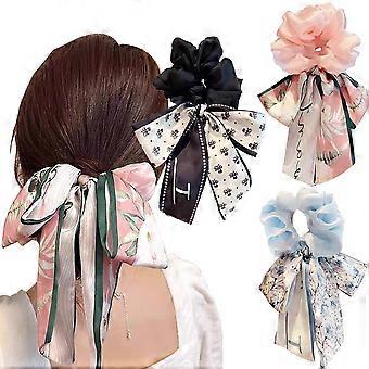 Large Floral Bow Hair Scrunchies with Long Tails, Boho Chiffon Bow Hair Tie for Ponytails 3 Pack