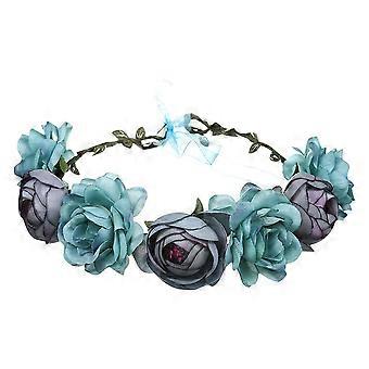 Blue Flower Crown Wedding Headpiece with Faux Silk Roses Peonies and Adjustable Ribbon Fit