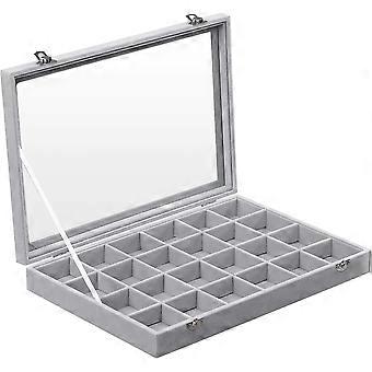 Gray Jewelry Box Display Case, Clear Glass Window, 24 Compartments