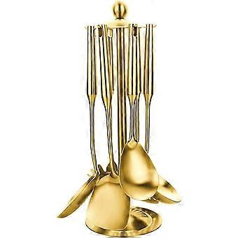 7 Piece Gold Stainless Steel Soup Spoon Set with Rack, AntiScald Wooden Handle for Home and Restaurant