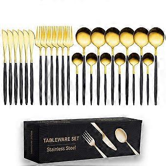 24Piece Black Gold Stainless Steel Cutlery Set with Steak Knives, Mirror Finish Flatware for 6