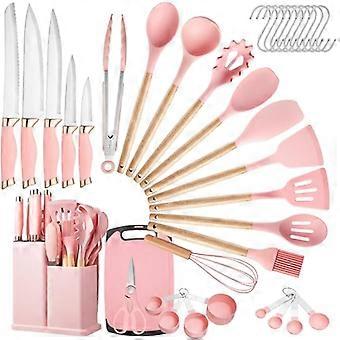37 PCS Pink Silicone Kitchen Utensils Set with Wooden Handles, Knife Set and Holder, Heat Resistant