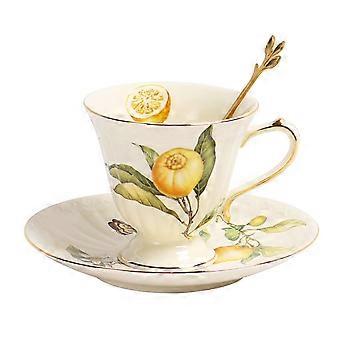 Tea Cup and Saucer Set with Golden Spoon, 6oz Cute Lemon Pattern Porcelain Coffee Mug