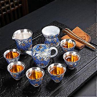 Chinese Porcelain Tea Set for 6 with Teapot and Cups, Luxury Metallic Enamel Gift