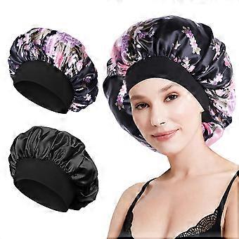 2PCS Satin Sleep Bonnet and Silk Hair Bonnet for Women, Wide Band, Frizz Reduction, Black and Sakura