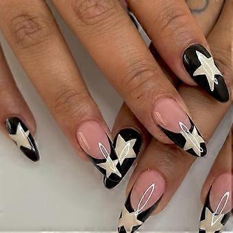 Black and White Star Almond Press On Nails Medium Length Soft Gel Fake Nails Reusable Full Cover