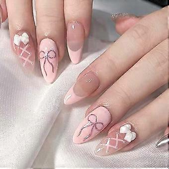 Elegant Almond French Press On Nails with 3D Bow Accents, Full Cover Tips for Wedding Party